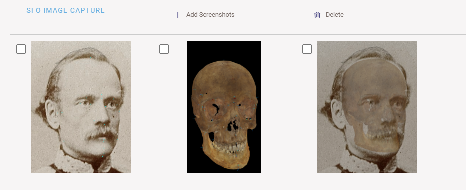 A pop-up window will appear (Figure 2) where we can select the screenshots that we have taken in each scene of the virtual laboratory, relative to the cephalometric points, the craniometric points and the skull-face overlays.